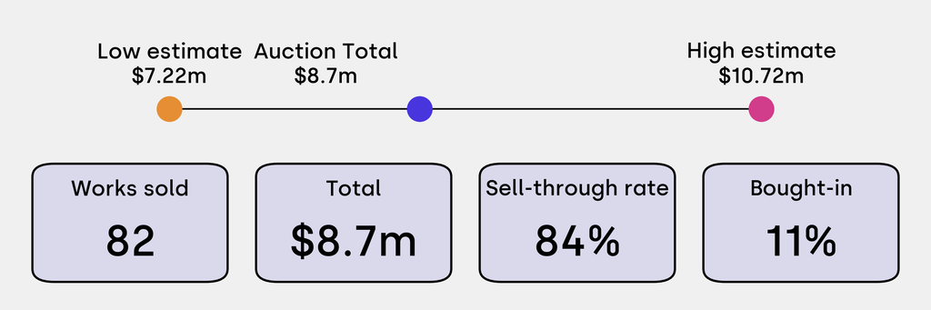 All results include the fees and premiums added to the price of a work of art when the auctioneer's hammer falls. Sale prices are compared to the auction house’s low estimate, which do not include premiums.