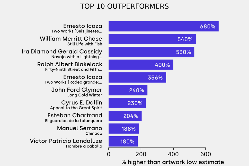 The outperformer sold for 680% above its low estimate. Ernesto Icaza, Two Works [Seis jinetes lanzando toro; El ganado] (1917), sold for $78,000 ($10,000 low estimate). It has been traded twice in the past.