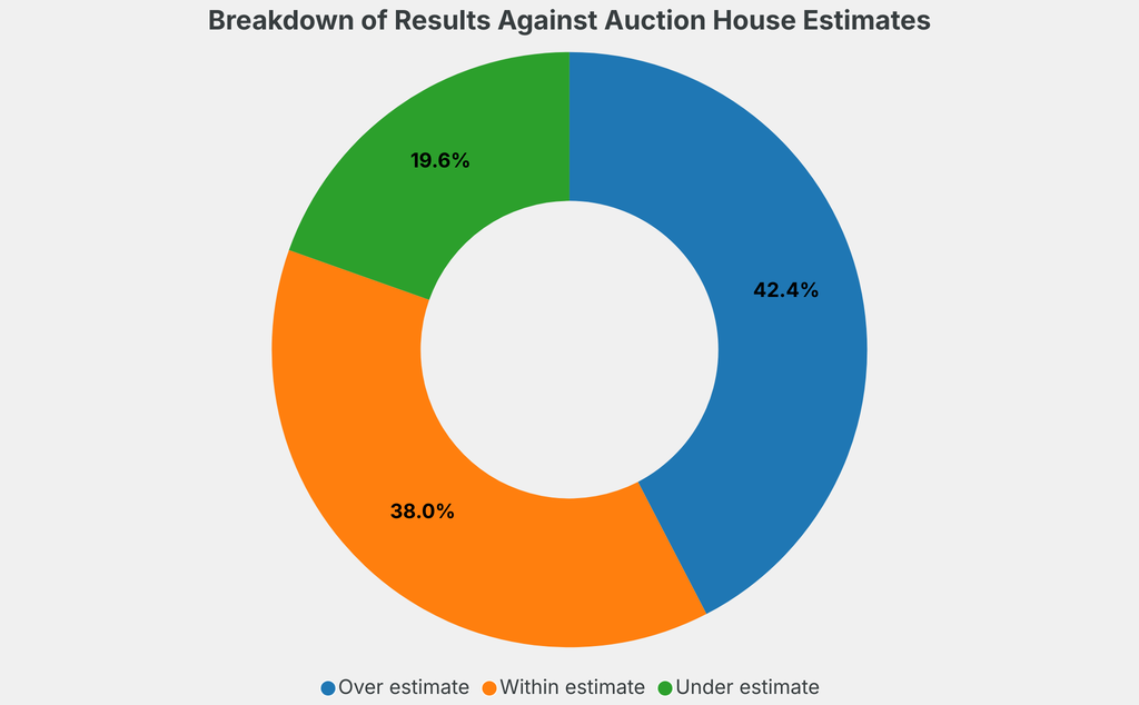 All results include the fees and premiums added to the price of a work of art when the auctioneer's hammer falls. Sale prices are compared to the auction house’s low estimate, which do not include premiums.