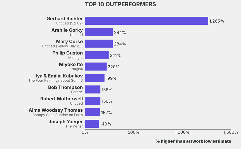 The outperformer sold for 1265% above its low estimate. Gerhard Richter, Untitled (5.2.89) (1989), sold for $409,600 ($30,000 low estimate). It has been traded once in the past.