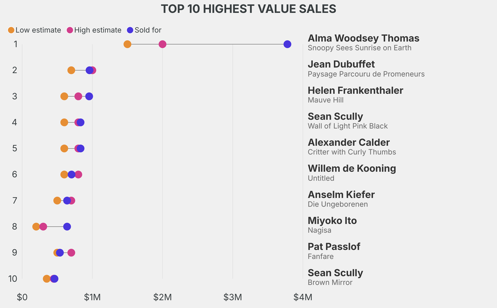 The star lot was: Alma Woodsey Thomas, Snoopy Sees Sunrise on Earth (1970), which sold for $3.78m, 152% above its $1.5m low estimate. It has been traded twice in the past.
