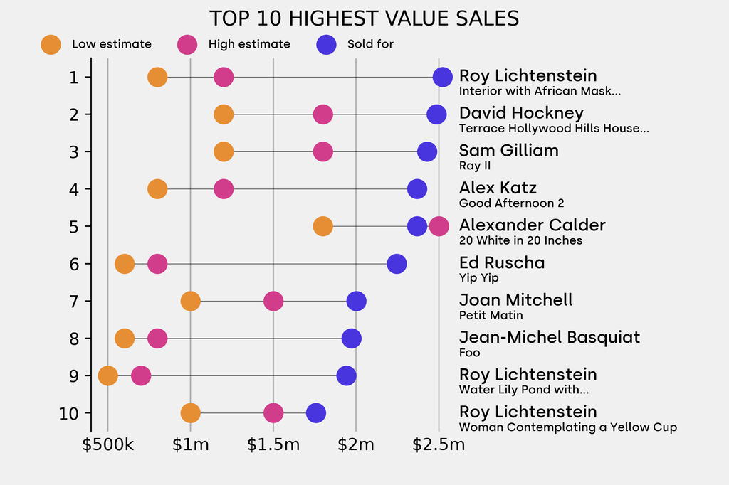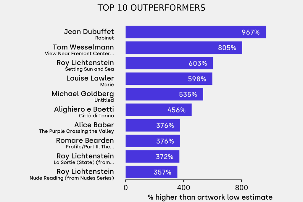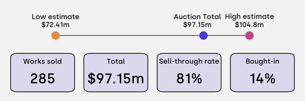 All results include the fees and premiums added to the price of a work of art when the auctioneer's hammer falls. Sale prices are compared to the auction house’s low estimate, which do not include premiums.