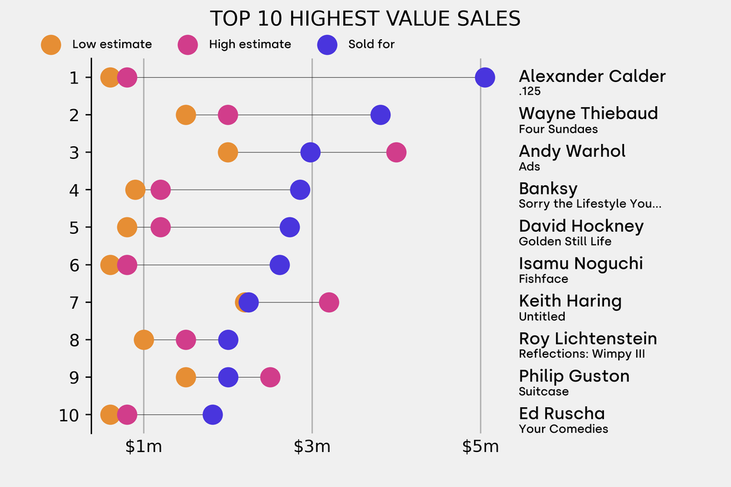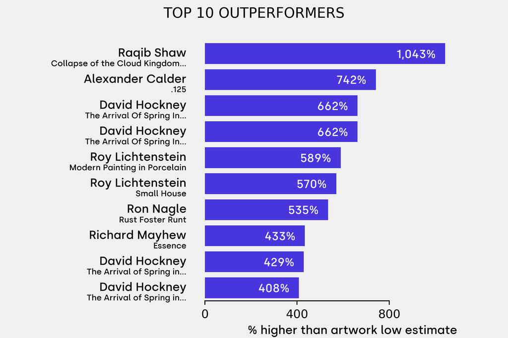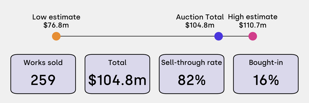 All results include the fees and premiums added to the price of a work of art when the auctioneer's hammer falls. Sale prices are compared to the auction house’s low estimate, which do not include premiums.