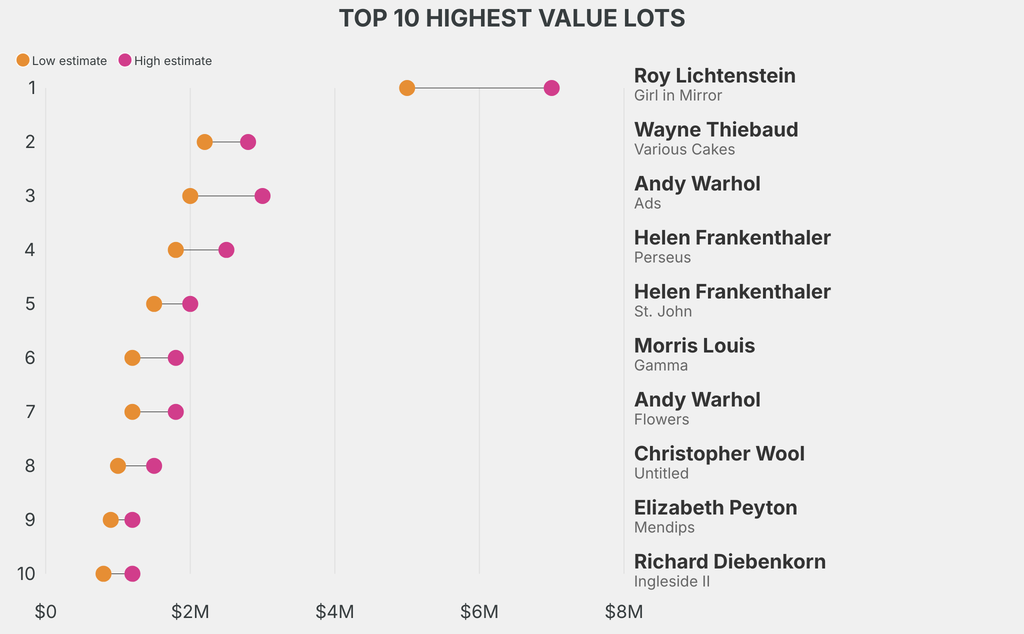 The highest-value lot announced is: Roy Lichtenstein, Girl in Mirror (1964), which is estimated to sell for between $5m and $7m. It has been traded 9 times in the past.