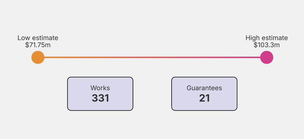 21 works are backed by guarantees, including: Helen Frankenthaler, St. John (1971). It is estimated to sell for between $1.5m and $2m. It has been traded twice in the past.