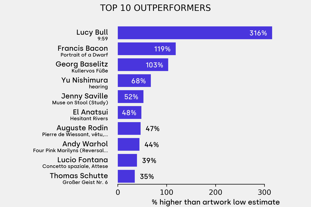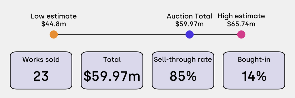 All results include the fees and premiums added to the price of a work of art when the auctioneer's hammer falls. Estimates, sale prices and totals are converted into US dollars. Sale prices are compared to the auction house’s low estimate, which do not include premiums.