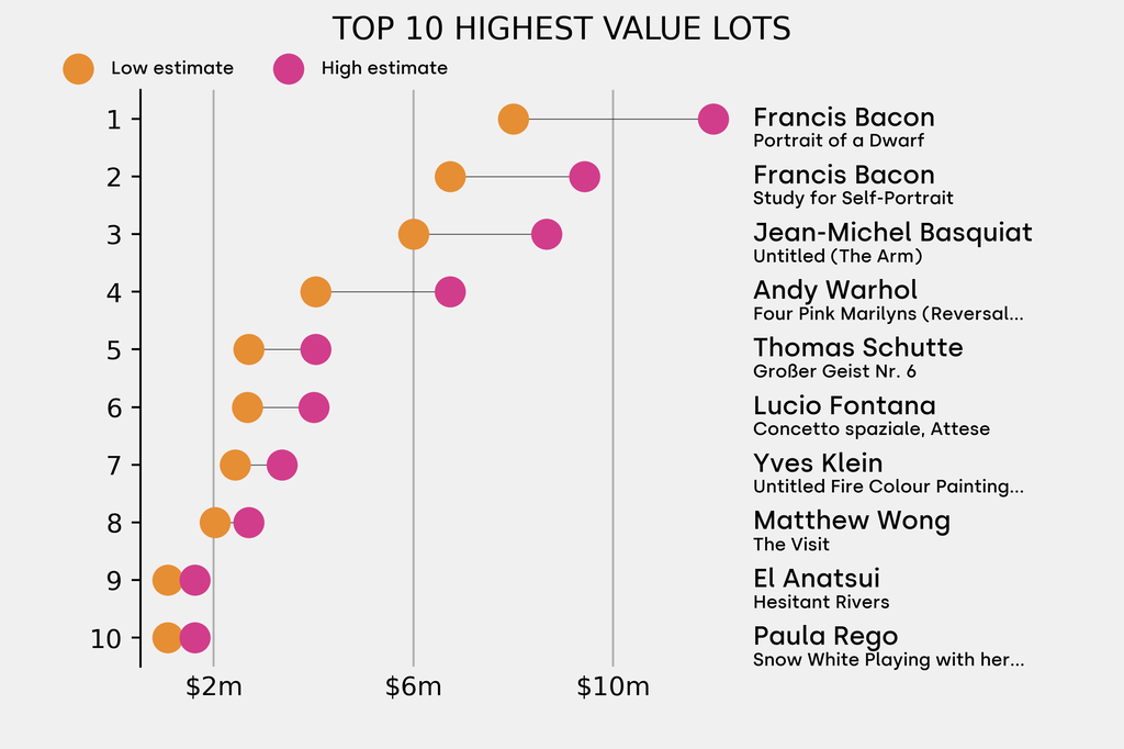 The highest-value lot announced is: Francis Bacon, Portrait of a Dwarf (1975), which is estimated to sell for between $8m and $12m. The work is backed by a guarantee. It has not been traded before.