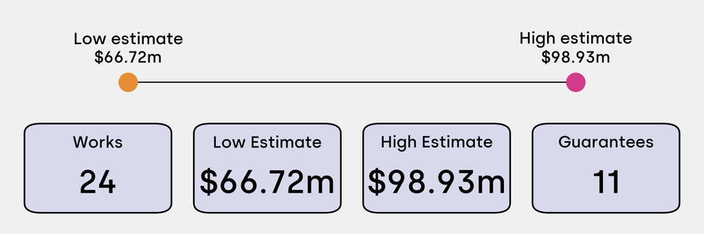 11 works are backed by guarantees, including: Dorothea Tanning, Interior with Sudden Joy (1951). It is estimated to sell for between $2m and $3m. It has been traded 3 times in the past.