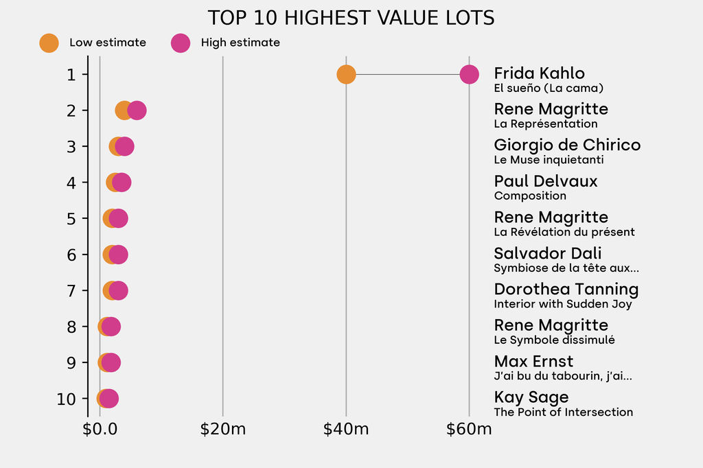 The highest-value lot announced is: Frida Kahlo, El sueño (La cama) (1940), which is estimated to sell for between $40m and $60m. The work is backed by a guarantee. It has been traded 3 times in the past.