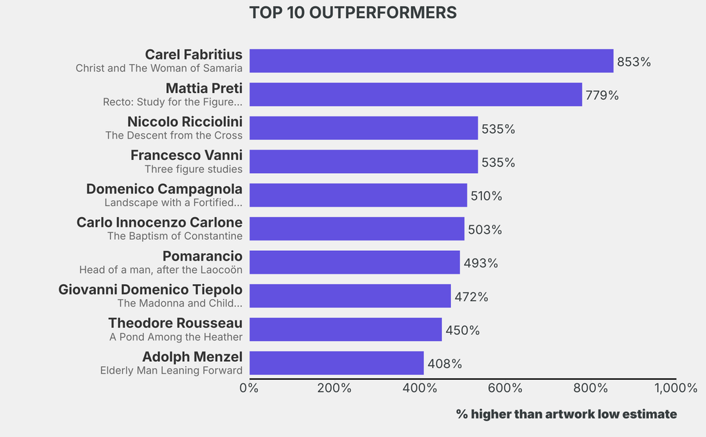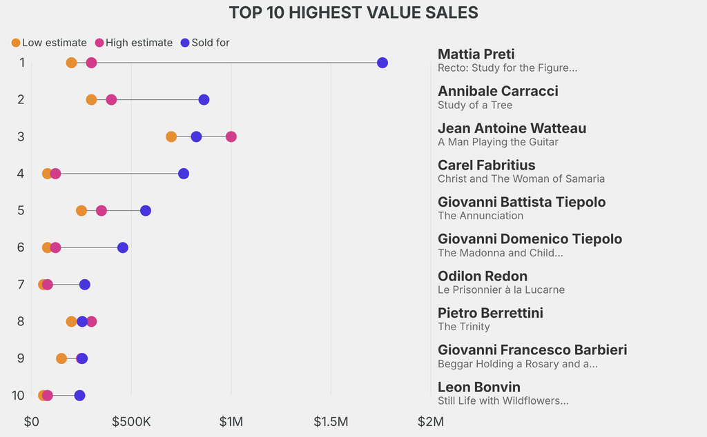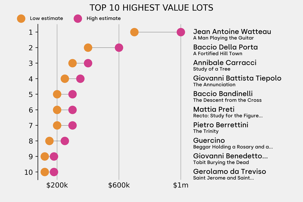 The highest-value lot announced is: Jean Antoine Watteau, A Man Playing the Guitar (Undated), which is estimated to sell for between $700,000 and $1m. It has been traded 6 times in the past.