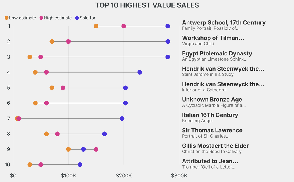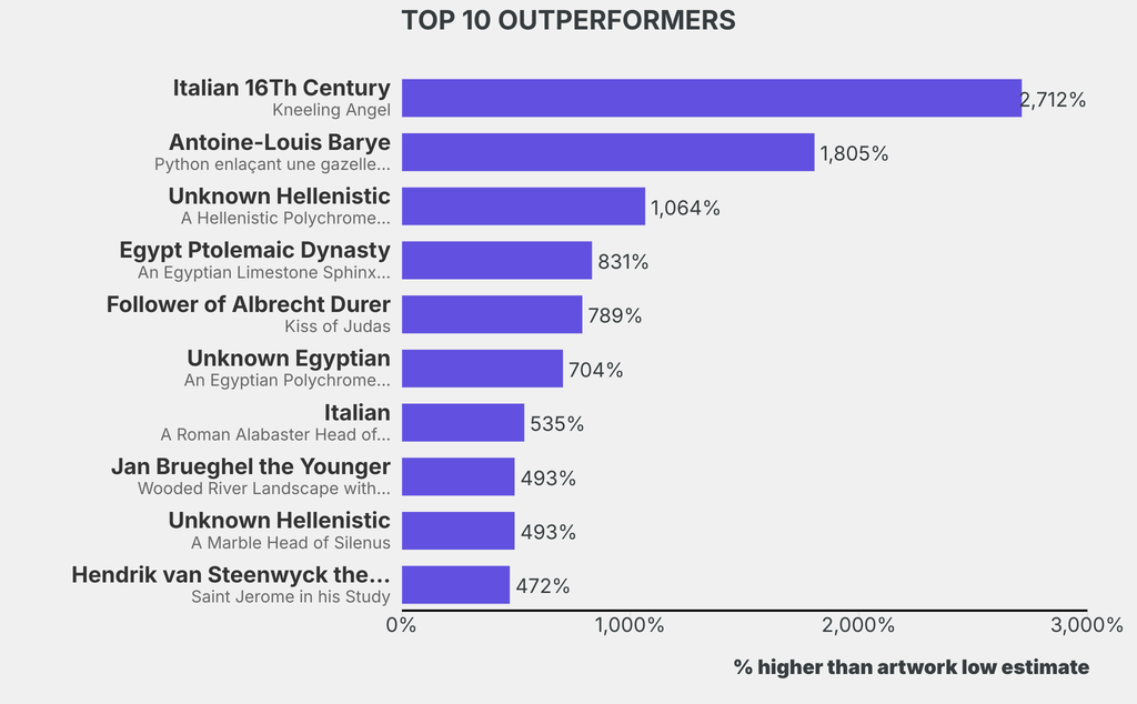 The outperformer sold for 2712% above its low estimate. Italian 16Th Century, Kneeling Angel (Undated), sold for $196,800 ($7,000 low estimate).