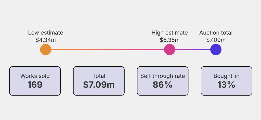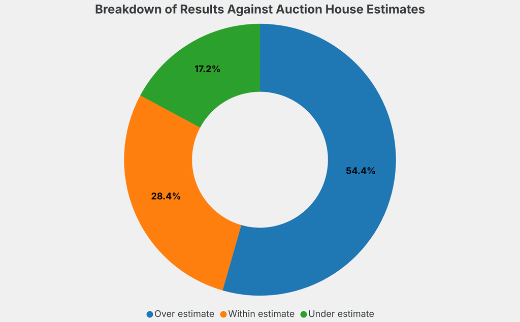 All results include the fees and premiums added to the price of a work of art when the auctioneer's hammer falls. Sale prices are compared to the auction house’s low estimate, which do not include premiums.