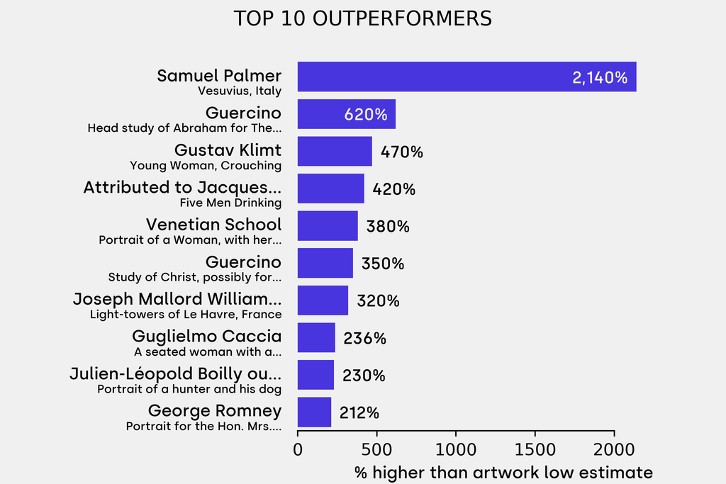 The outperformer sold for 2140% above its low estimate. Samuel Palmer, Vesuvius, Italy (1838), sold for $336,000 ($15,000 low estimate). It has been traded twice in the past.