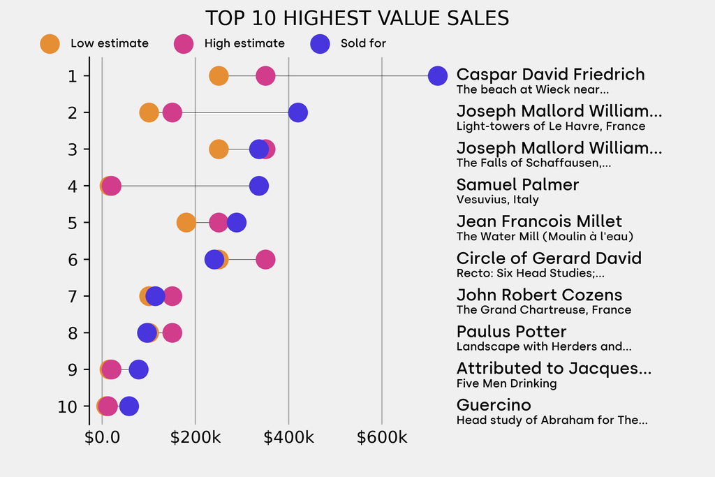 The star lot was: Caspar David Friedrich, The beach at Wieck near Greifswald, circa 1815-21 (1815), which sold for $720,000, 188% above its $250,000 low estimate. It has been traded 4 times in the past.