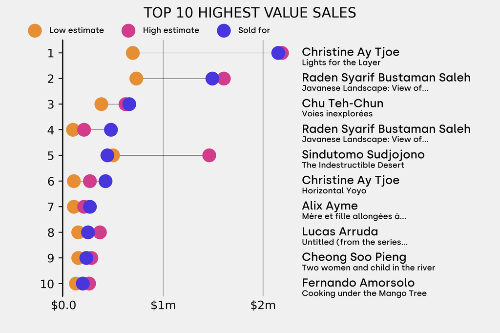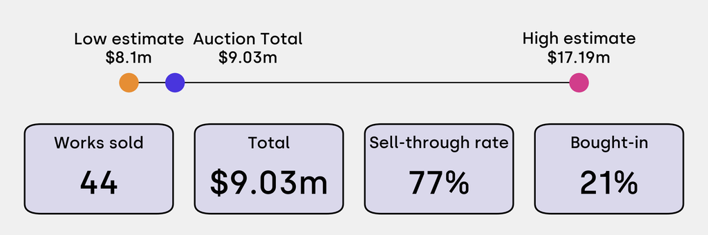 All results include the fees and premiums added to the price of a work of art when the auctioneer's hammer falls. Estimates, sale prices and totals are converted into US dollars. Sale prices are compared to the auction house’s low estimate, which do not include premiums.