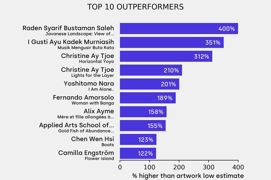 The outperformer sold for 399% above its low estimate. Raden Syarif Bustaman Saleh, Javanese Landscape: View of Talagabodas (Undated), sold for $473,800 ($94,800 low estimate). It has been traded once in the past.