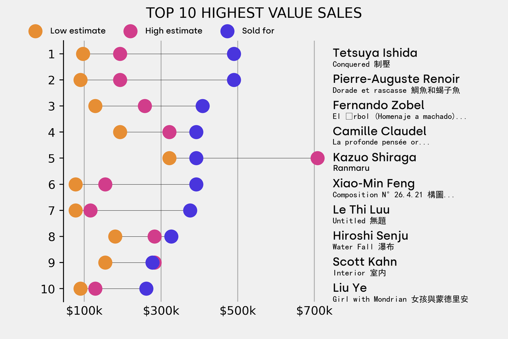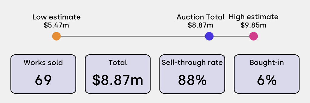 All results include the fees and premiums added to the price of a work of art when the auctioneer's hammer falls. Estimates, sale prices and totals are converted into US dollars. Sale prices are compared to the auction house’s low estimate, which do not include premiums.