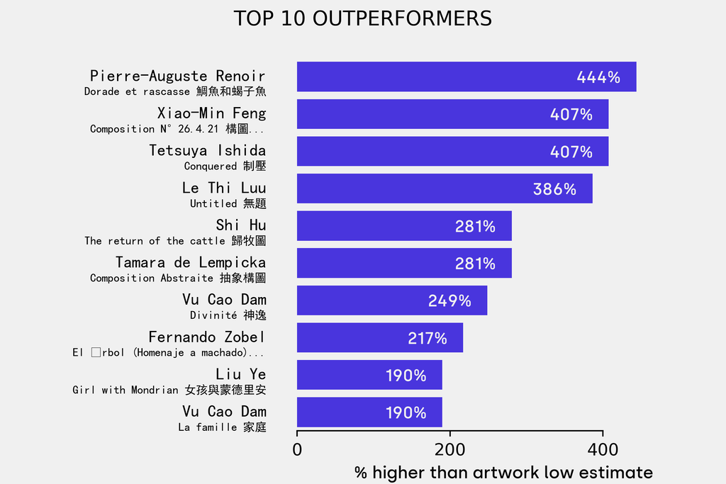 The outperformer sold for 443% above its low estimate. Pierre-Auguste Renoir, Dorade et rascasse 鯛魚和蝎子魚 (1912), sold for $489,800 ($90,100 low estimate). It has been traded 7 times in the past.