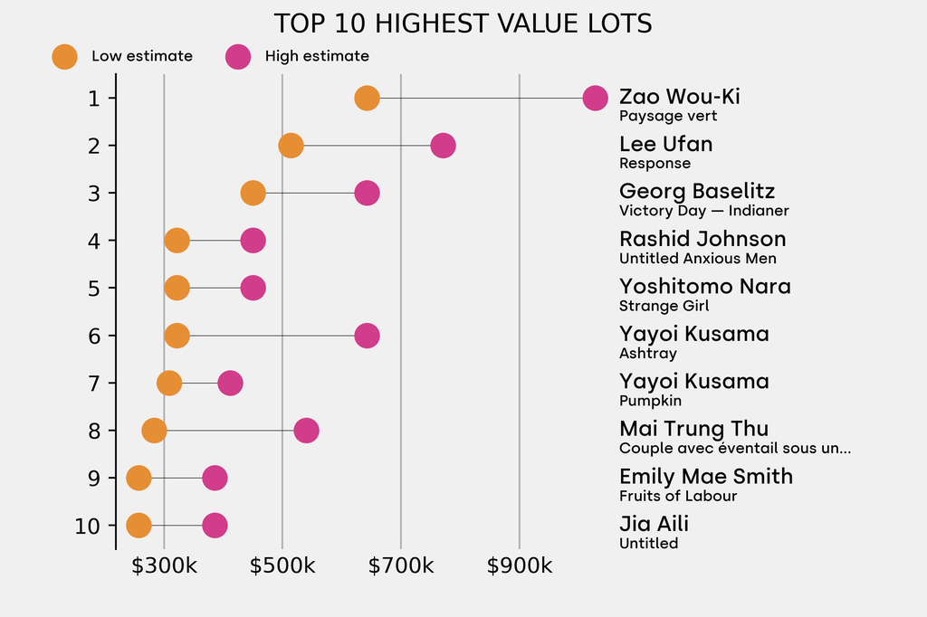 The highest-value lot announced is: Zao Wou-ki, Paysage vert (1950), which is estimated to sell for between $642,800 and $1.03m. It has been traded twice in the past.