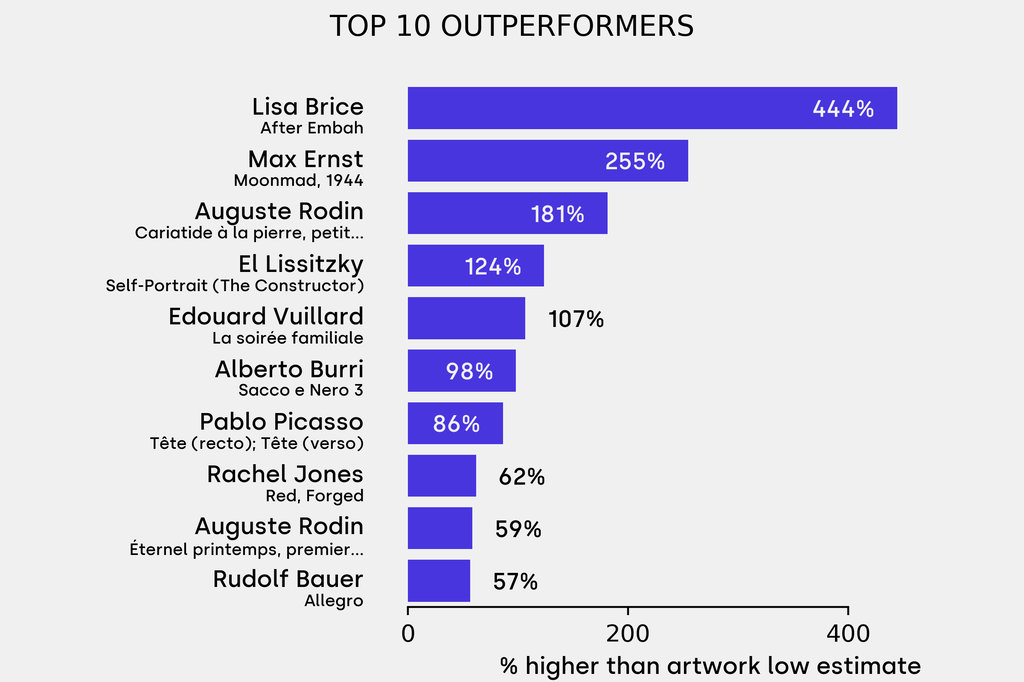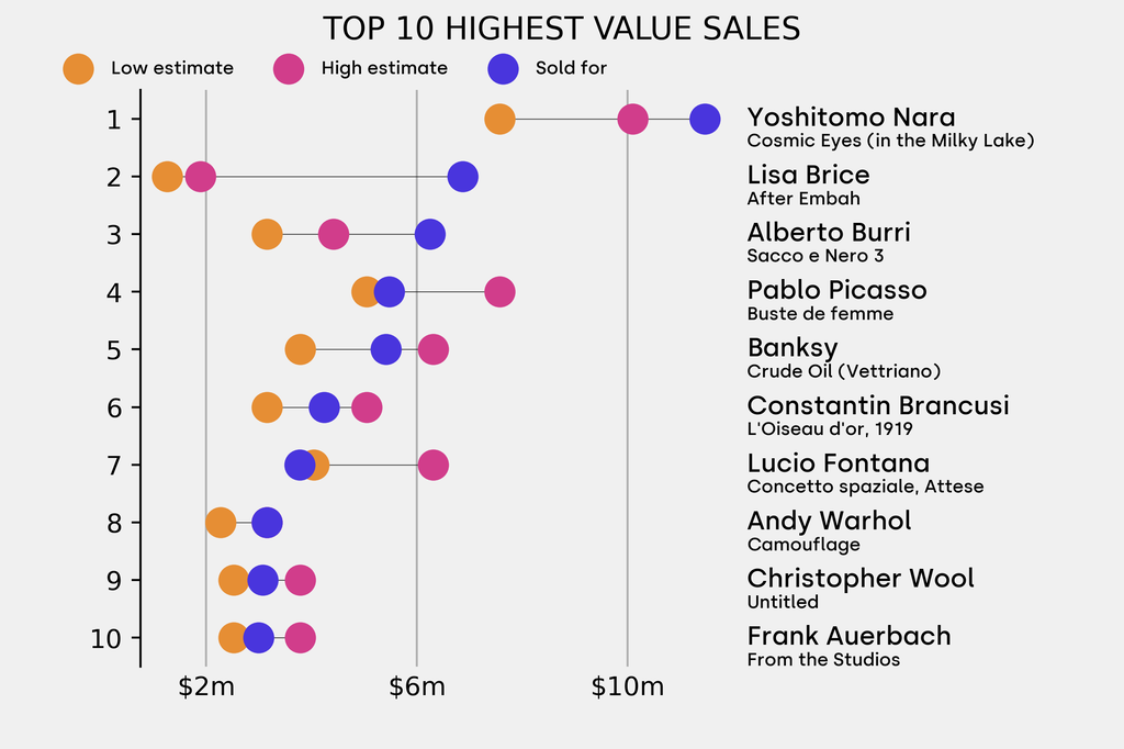 All results include the fees and premiums added to the price of a work of art when the auctioneer's hammer falls. Estimates, sale prices and totals are converted into US dollars. Sale prices are compared to the auction house’s low estimate, which do not include premiums.
