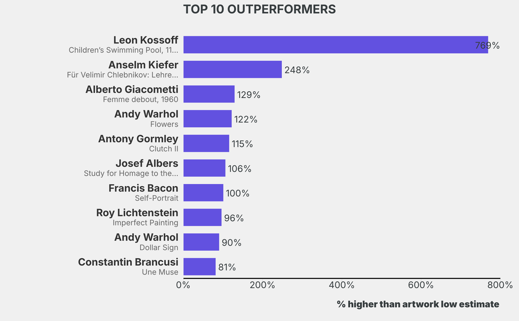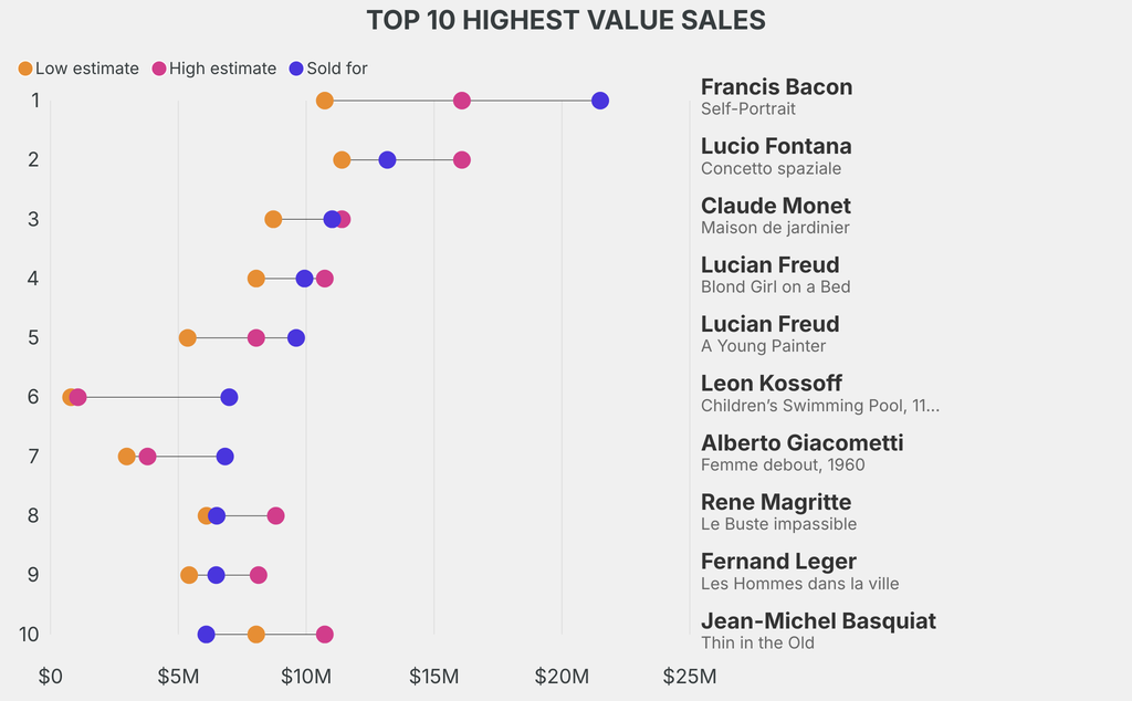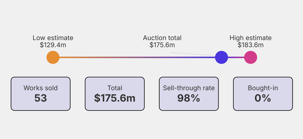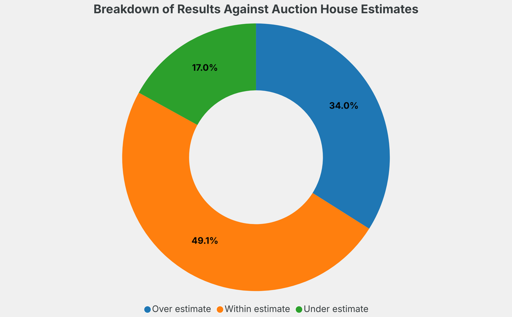 All results include the fees and premiums added to the price of a work of art when the auctioneer's hammer falls. Estimates, sale prices and totals are converted into US dollars. Sale prices are compared to the auction house’s low estimate, which do not include premiums.