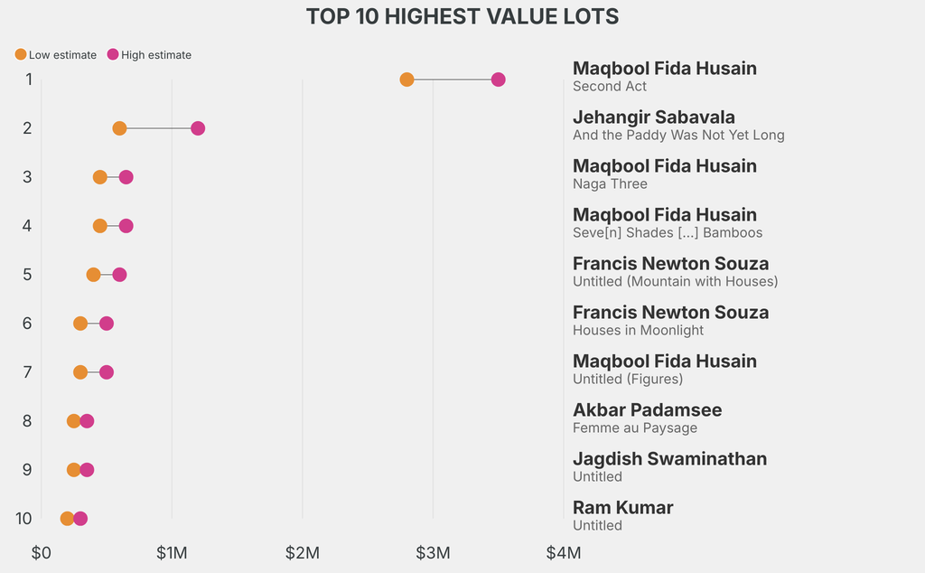 The highest-value lot announced is: M.F. Husain, Second Act (1958), which is estimated to sell for between $2.8m and $3.5m. It has been traded twice in the past.