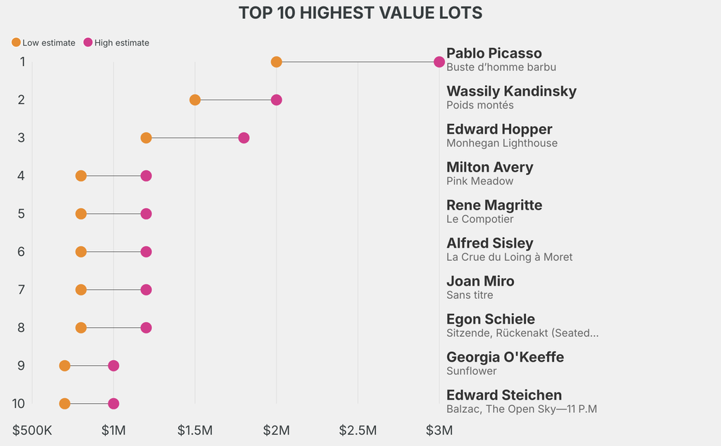 The highest-value lot announced is: Pablo Picasso, Buste d’homme barbu (1965), which is estimated to sell for between $2m and $3m. It has been traded 7 times in the past.