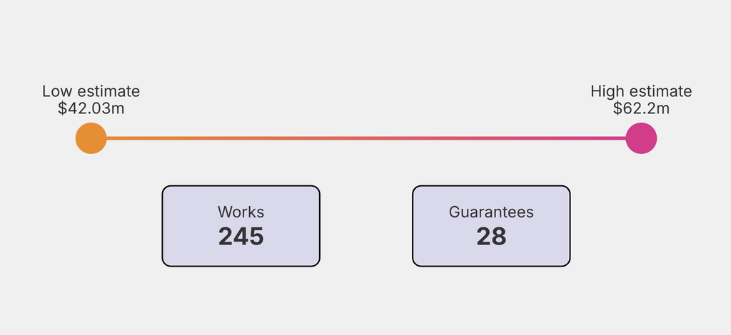 28 works are backed by guarantees, including: Joan Miro, Sans titre (1939). It is estimated to sell for between $800,000 and $1.2m. It has been traded 6 times in the past.