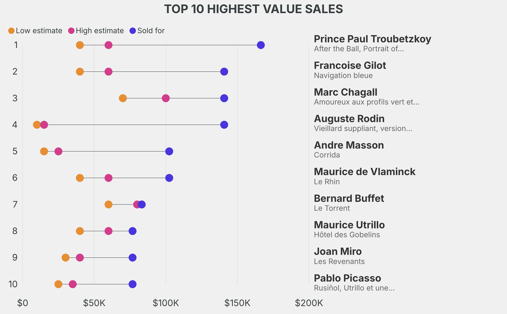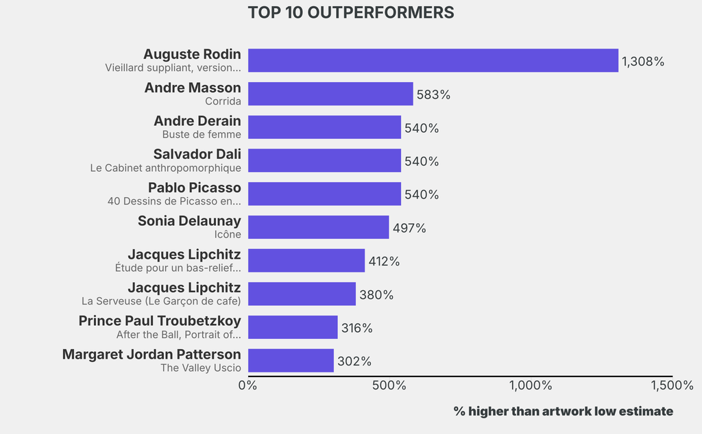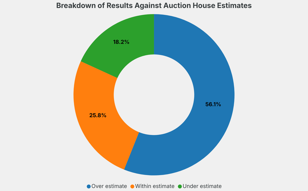 All results include the fees and premiums added to the price of a work of art when the auctioneer's hammer falls. Sale prices are compared to the auction house’s low estimate, which do not include premiums.