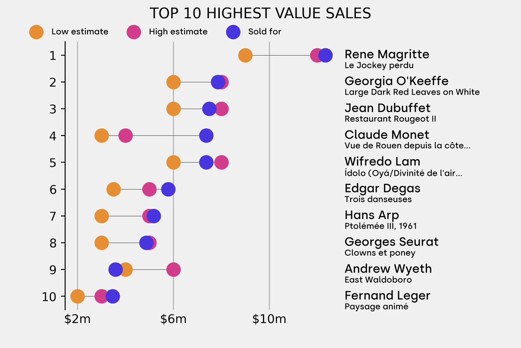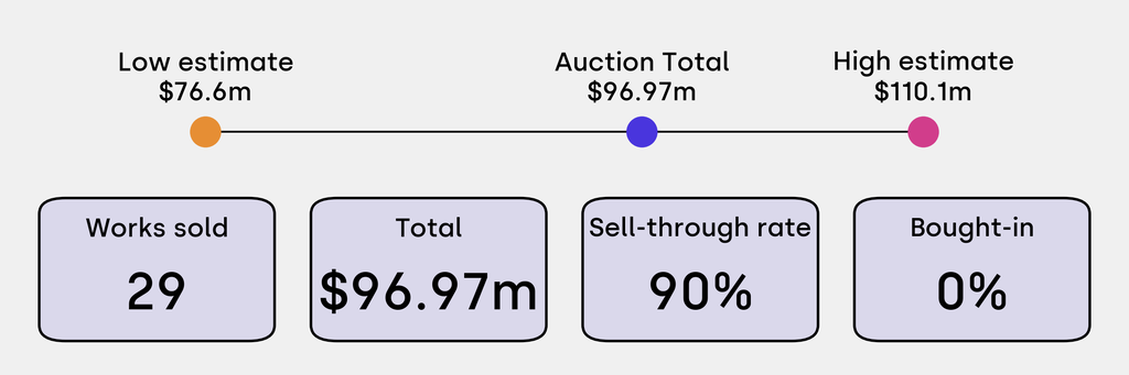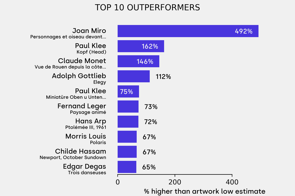 All results include the fees and premiums added to the price of a work of art when the auctioneer's hammer falls. Sale prices are compared to the auction house’s low estimate, which do not include premiums.