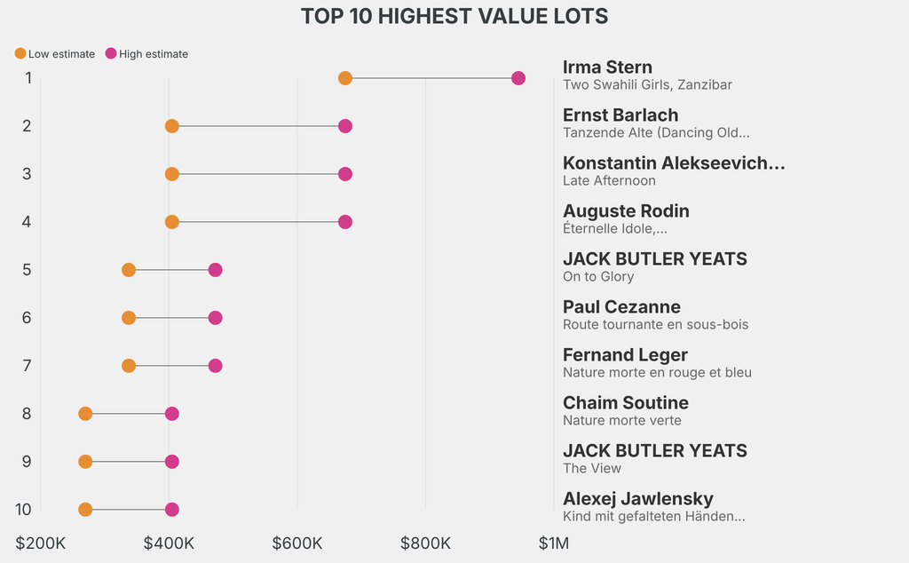 The highest-value lot announced is: Irma Stern, Two Swahili Girls, Zanzibar (1945), which is estimated to sell for between $674,800 and $944,800. It has not been traded before.