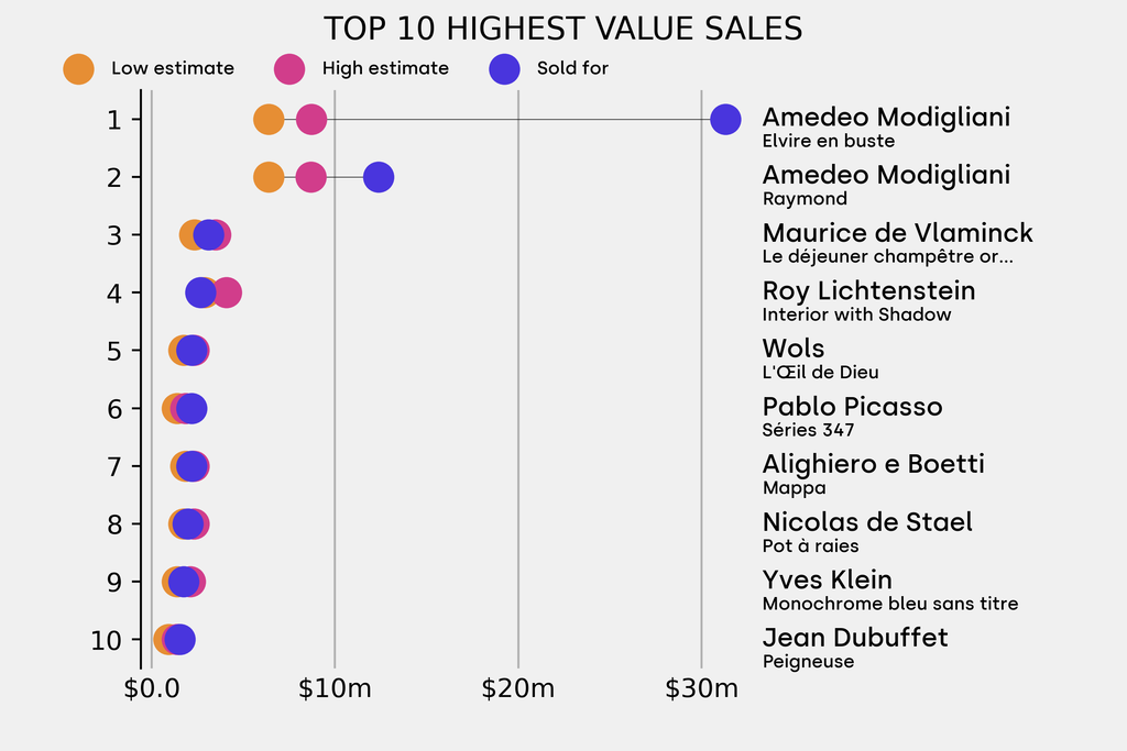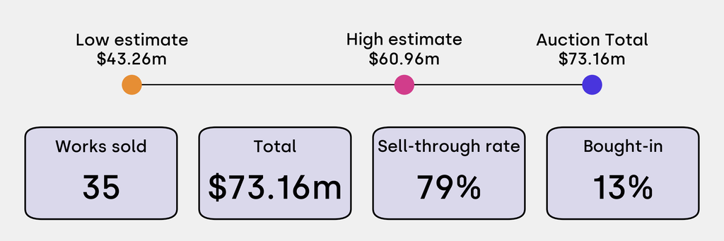 All results include the fees and premiums added to the price of a work of art when the auctioneer's hammer falls. Estimates, sale prices and totals are converted into US dollars. Sale prices are compared to the auction house’s low estimate, which do not include premiums.