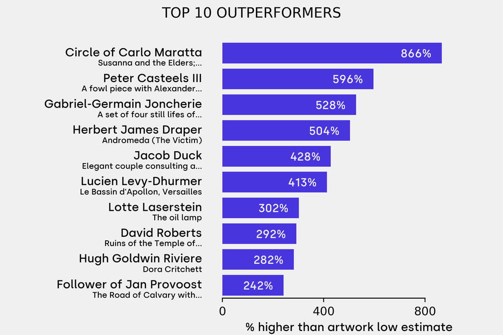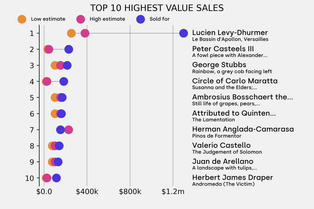 All results include the fees and premiums added to the price of a work of art when the auctioneer's hammer falls. Estimates, sale prices and totals are converted into US dollars. Sale prices are compared to the auction house’s low estimate, which do not include premiums.