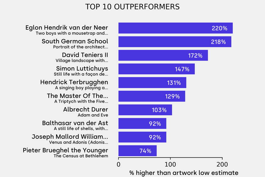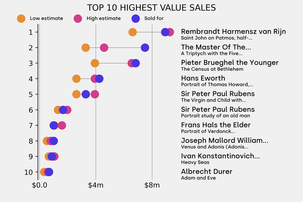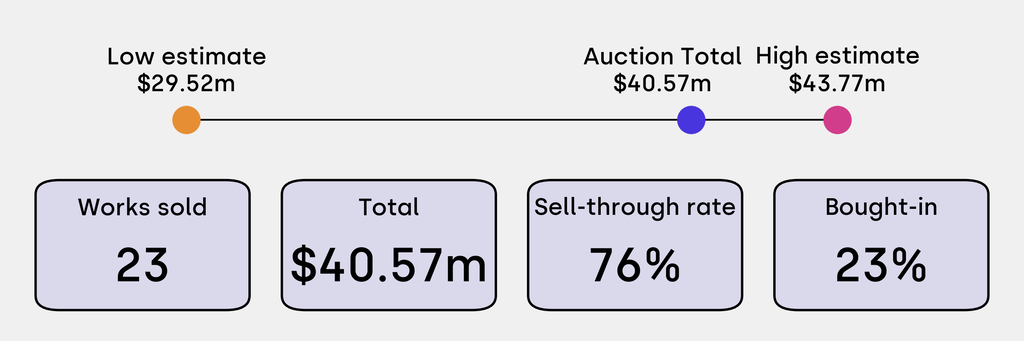 All results include the fees and premiums added to the price of a work of art when the auctioneer's hammer falls. Estimates, sale prices and totals are converted into US dollars. Sale prices are compared to the auction house’s low estimate, which do not include premiums.