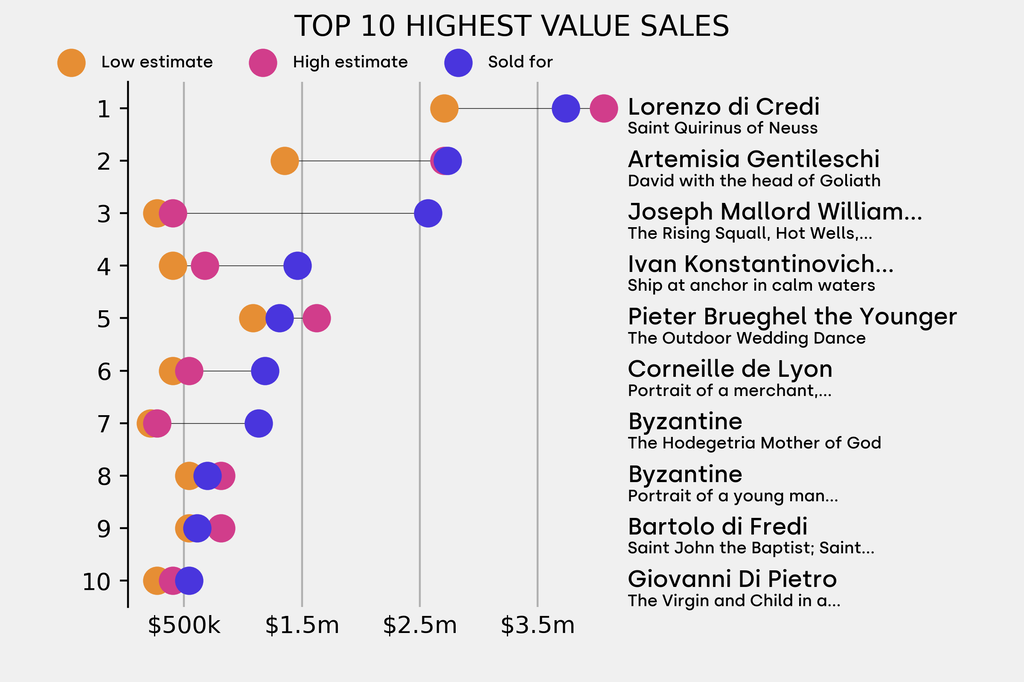 All results include the fees and premiums added to the price of a work of art when the auctioneer's hammer falls. Estimates, sale prices and totals are converted into US dollars. Sale prices are compared to the auction house’s low estimate, which do not include premiums.