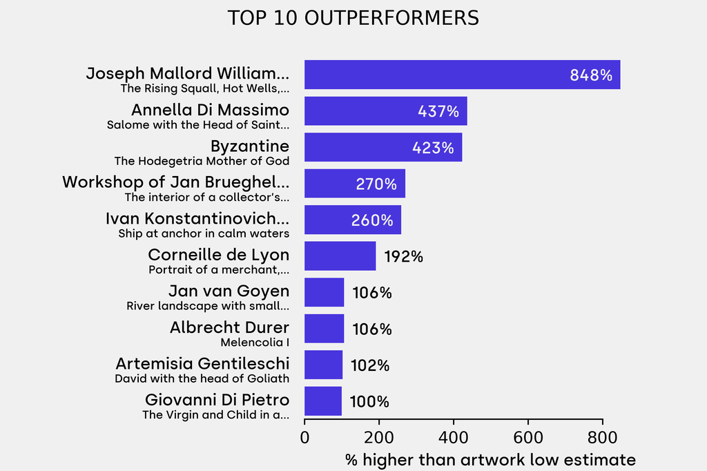 The outperformer sold for 848% above its low estimate. J.M.W. Turner, The Rising Squall, Hot Wells, from St Vincent's Rock, Bristol (Undated), sold for $2.57m ($270,800 low estimate). It has been traded 6 times in the past.