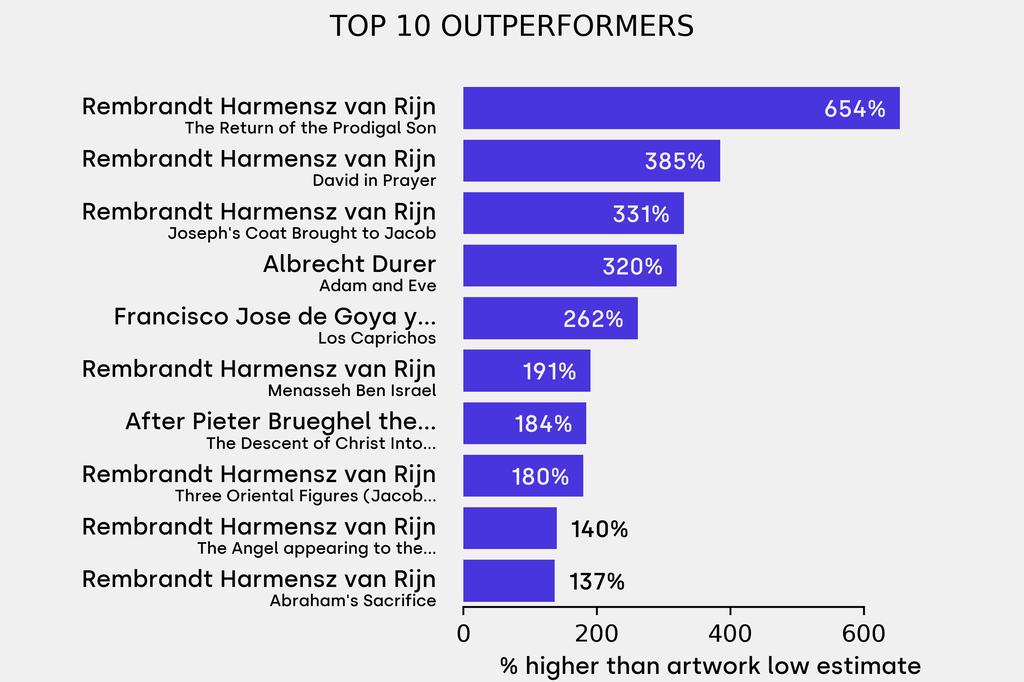The outperformer sold for 653% above its low estimate. Rembrandt, The Return of the Prodigal Son (1636), sold for $59,300 ($7,865 low estimate).