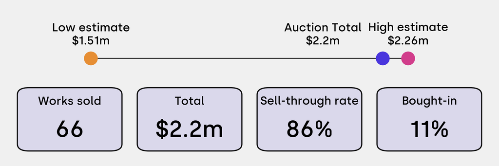All results include the fees and premiums added to the price of a work of art when the auctioneer's hammer falls. Estimates, sale prices and totals are converted into US dollars. Sale prices are compared to the auction house’s low estimate, which do not include premiums.
