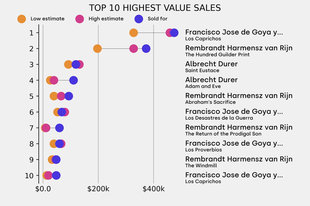 The star lot was: Goya, Los Caprichos (1797), which sold for $474,400, 44% above its $327,700 low estimate. It has been traded 7 times in the past.