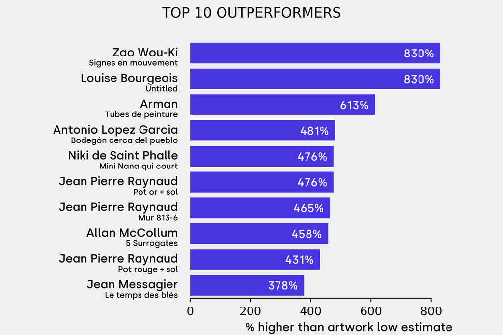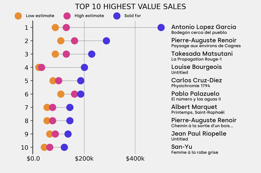 All results include the fees and premiums added to the price of a work of art when the auctioneer's hammer falls. Estimates, sale prices and totals are converted into US dollars. Sale prices are compared to the auction house’s low estimate, which do not include premiums.