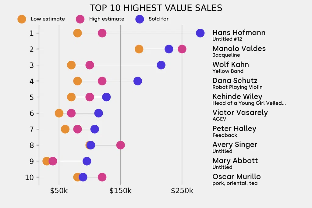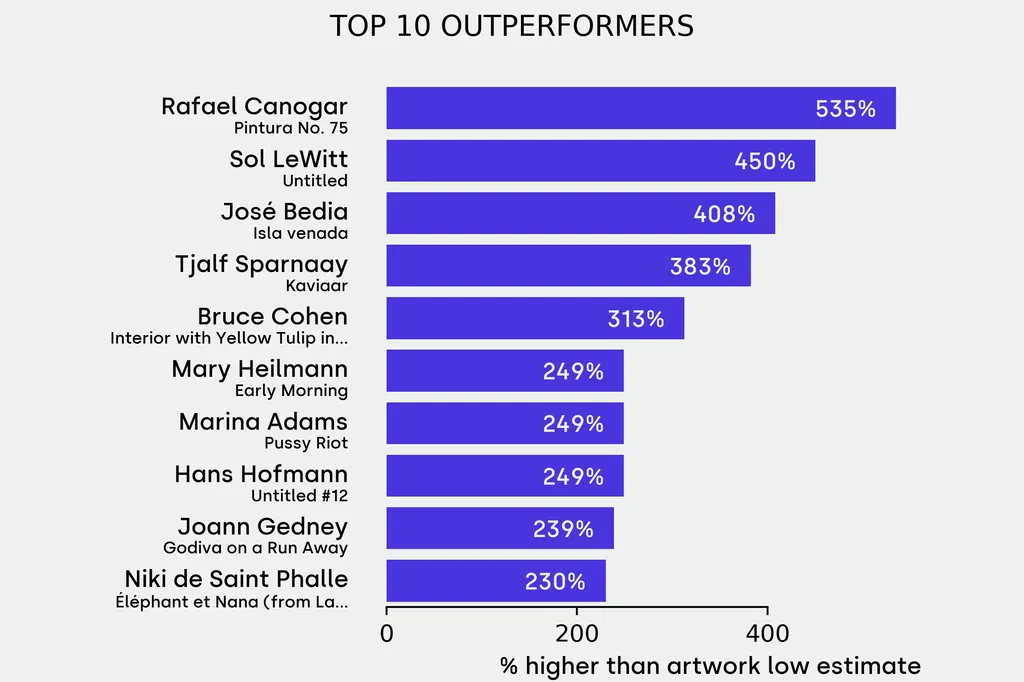 All results include the fees and premiums added to the price of a work of art when the auctioneer's hammer falls. Sale prices are compared to the auction house’s low estimate, which do not include premiums.