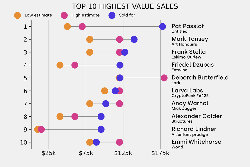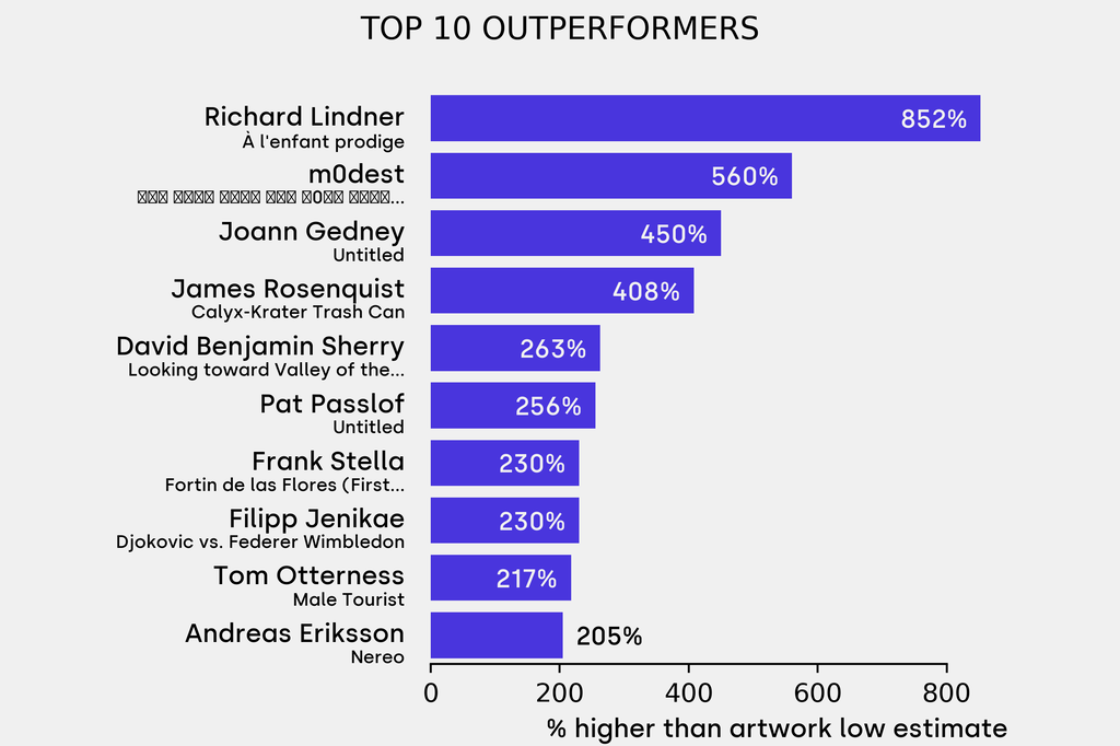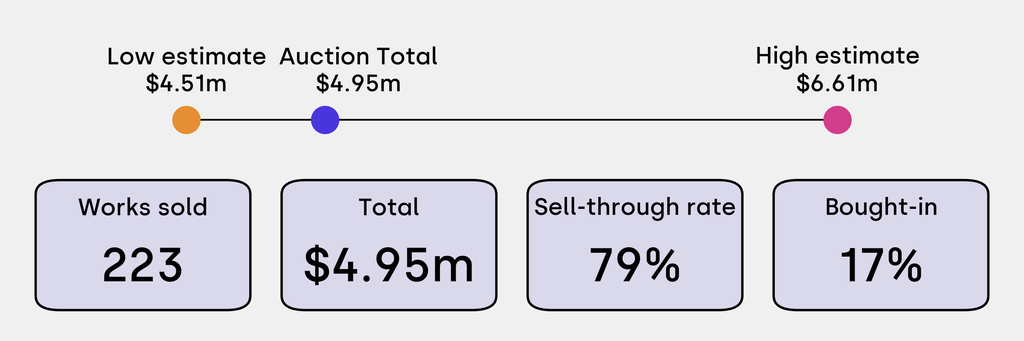 All results include the fees and premiums added to the price of a work of art when the auctioneer's hammer falls. Sale prices are compared to the auction house’s low estimate, which do not include premiums.