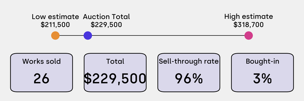1 work was bought-in: Helena Sarin, OM: Mediations of the GAN Artist (2019), estimated at $8,000 (low) to $12,000 (high). It has been traded 7 times in the past.