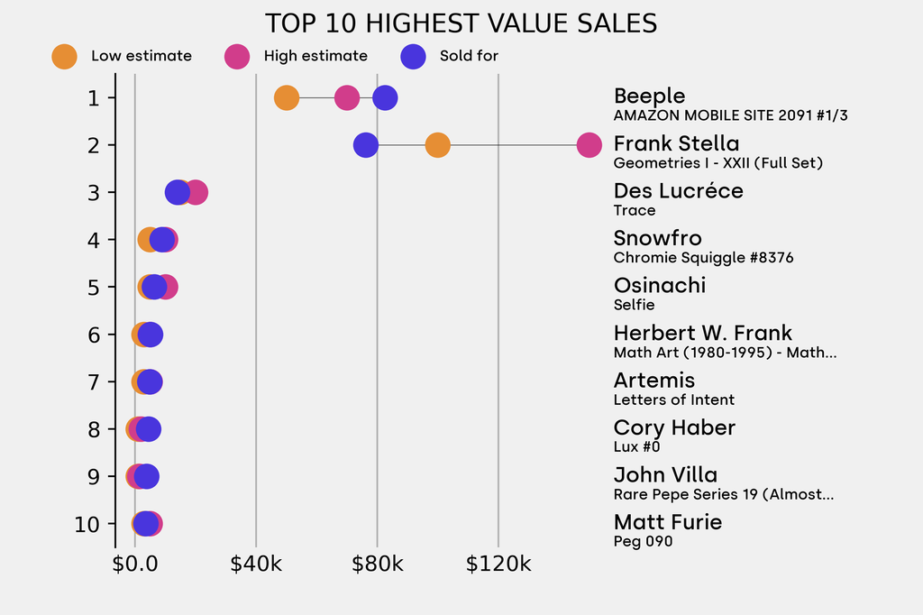 The star lot was: Beeple, AMAZON MOBILE SITE 2091 #1/3 (2022), which sold for $82,500, 65% above its $50,000 low estimate. It has been traded once in the past.