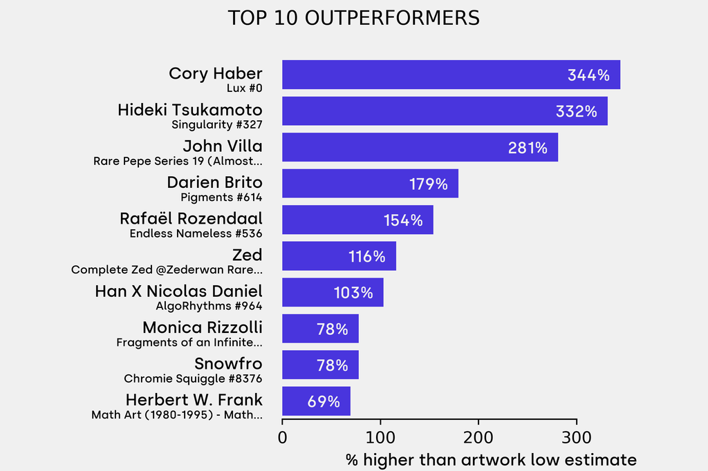 All results include the fees and premiums added to the price of a work of art when the auctioneer's hammer falls. Sale prices are compared to the auction house’s low estimate, which do not include premiums.