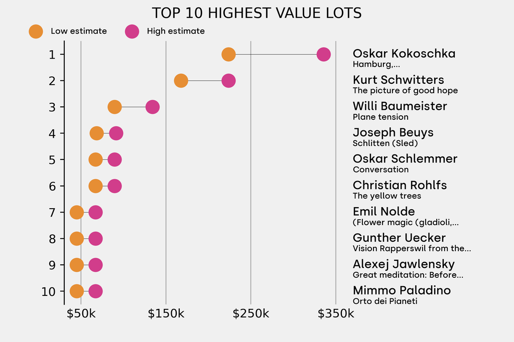 The highest-value lot announced is: Oskar Kokoschka, Hamburg, Binnenalster/Jungfernstieg (1926), which is estimated to sell for between $223,700 and $335,600. It has been traded 7 times in the past.
