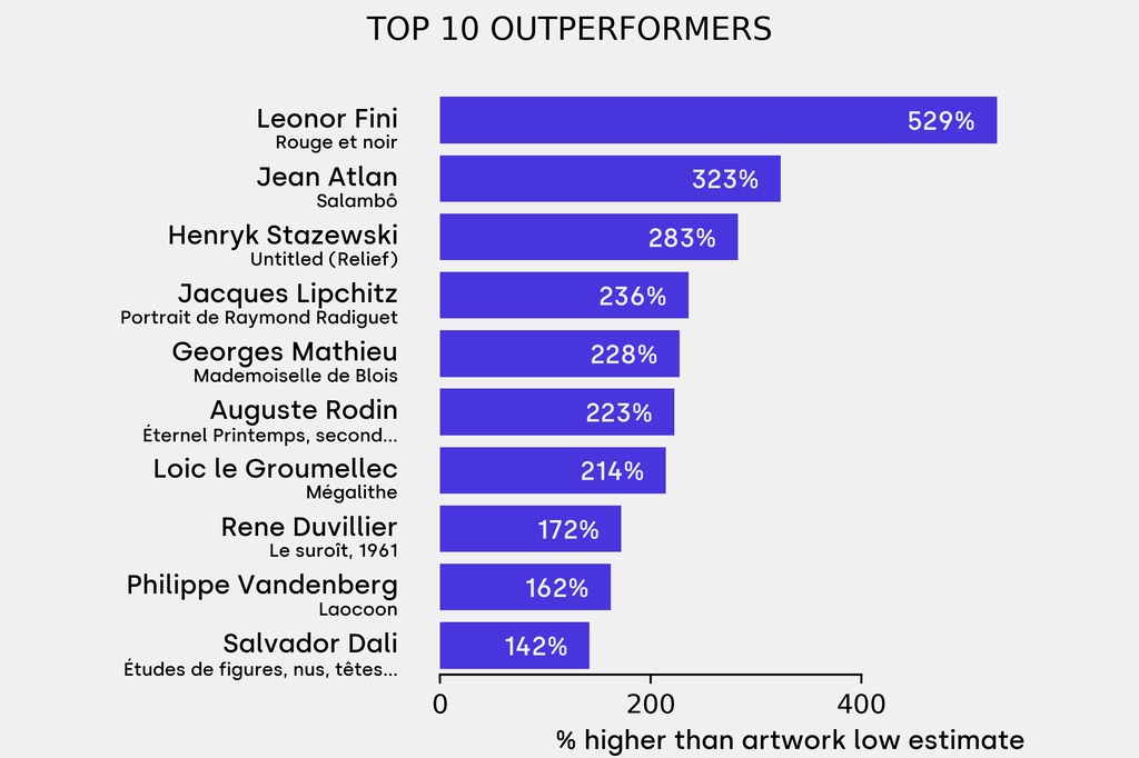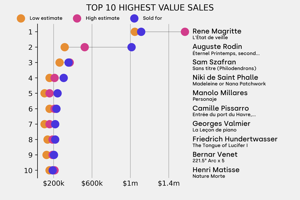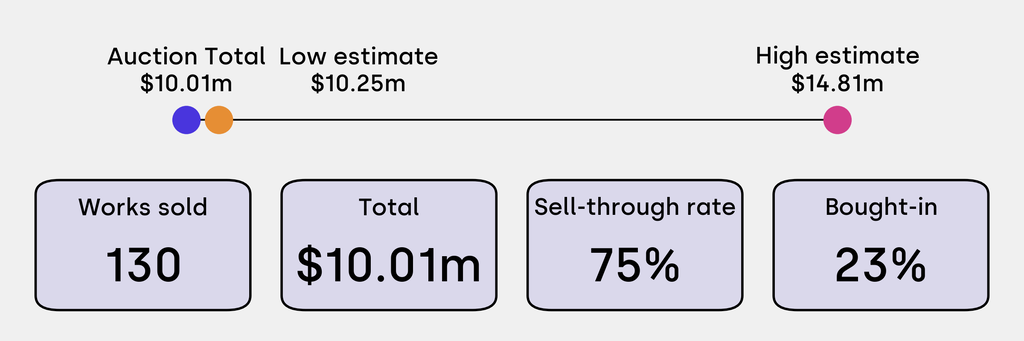 All results include the fees and premiums added to the price of a work of art when the auctioneer's hammer falls. Estimates, sale prices and totals are converted into US dollars. Sale prices are compared to the auction house’s low estimate, which do not include premiums.