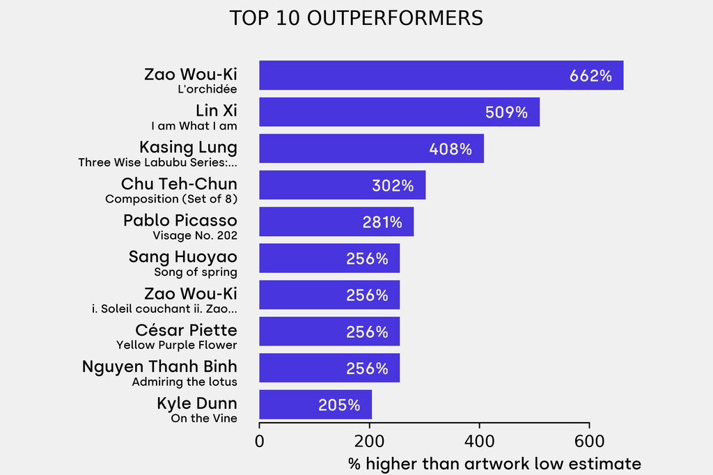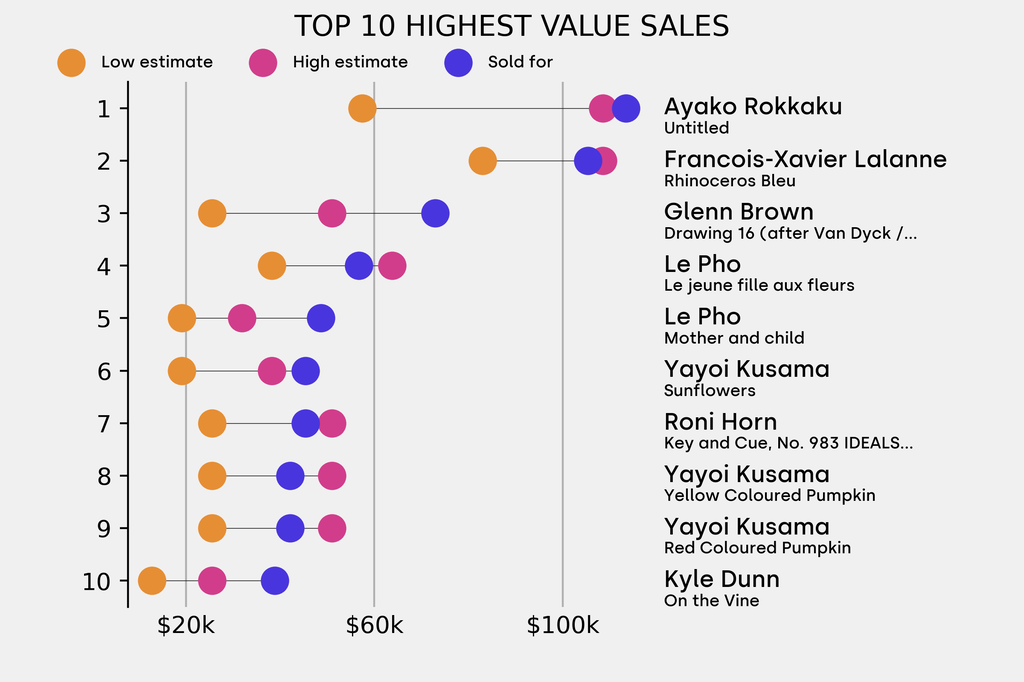 All results include the fees and premiums added to the price of a work of art when the auctioneer's hammer falls. Estimates, sale prices and totals are converted into US dollars. Sale prices are compared to the auction house’s low estimate, which do not include premiums.