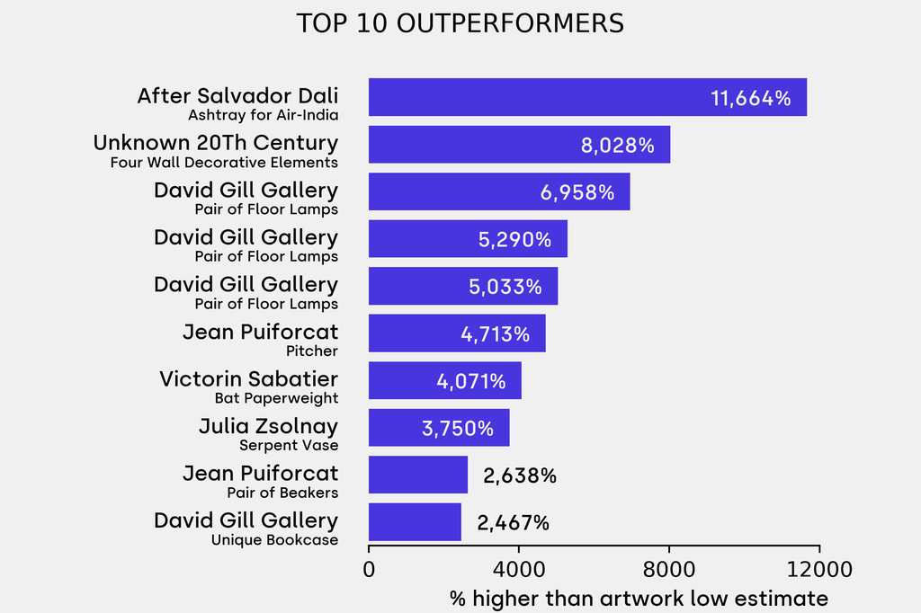 The outperformer sold for 11663% above its low estimate. After Salvador Dali, Ashtray for Air-India (1967), sold for $95,100 ($808 low estimate). The work was backed by a guarantee.
