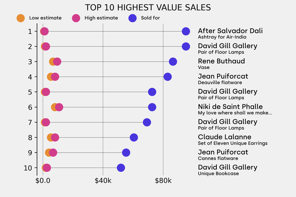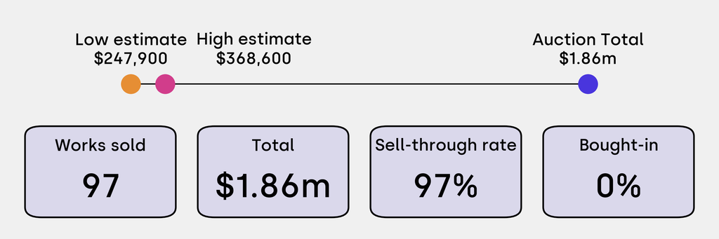 All results include the fees and premiums added to the price of a work of art when the auctioneer's hammer falls. Estimates, sale prices and totals are converted into US dollars. Sale prices are compared to the auction house’s low estimate, which do not include premiums.